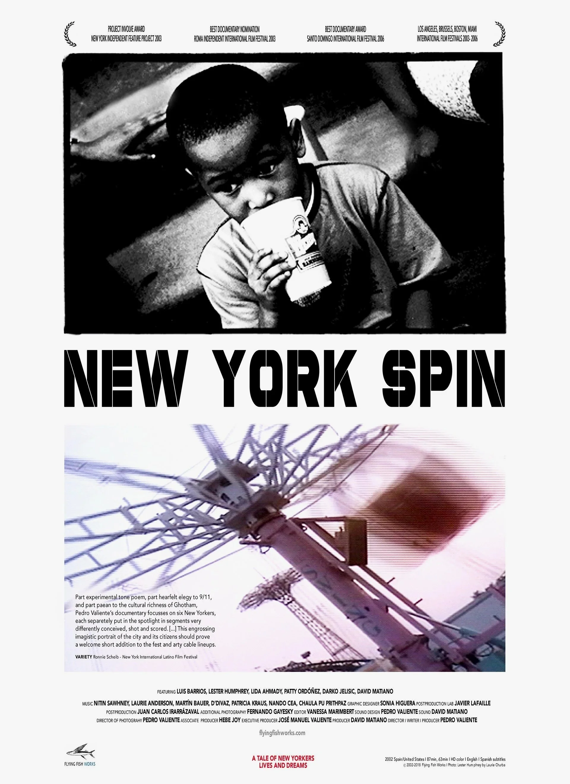 New York Spin (2002, Spain, 87:00 I 63:00) features 24 segments with 6 leading and 18 supporting characters, offering a portrait of New York’s life. Lester Humphrey boy from Brooklyn loves The Rock. Lida Ahmady is an Afghan student of Chinese medicine. Priest Luis Barrios baptized The Latin Kings. Patty Ordóñez is a deaf costume designer. Bosnian drummer Darko Jelisic lost his hand at war. Mexican David Matiano dreams of dancing in New York. I IMDb